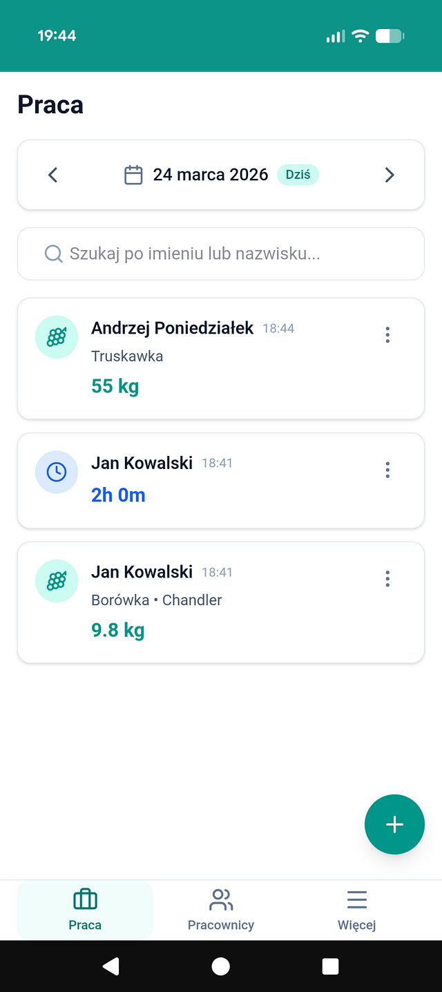 Rejestruj pracę akordową i godzinową z podziałem na kwatery, uprawy i odmiany. Połącz wagę Bluetooth — system automatycznie odejmie tarę pojemnika i zapisze wagę netto.